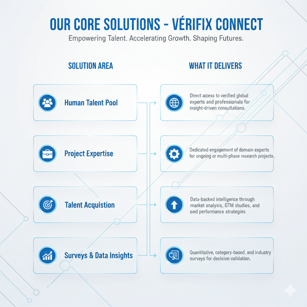 At Vérifix Connect, we understand that every industry has its unique challenges and opportunities. Our global network of verified experts and specialized talent solutions are tailored to meet the distinct needs of various sectors, helping you achieve precise insights and strategic growth.
