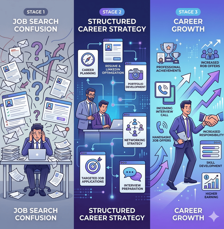 Instead of offering generic advice or one-time consultations, our programs focus on structured career execution. We combine practical frameworks, expert insights, and proactive support to help professionals position themselves more effectively in the job market.